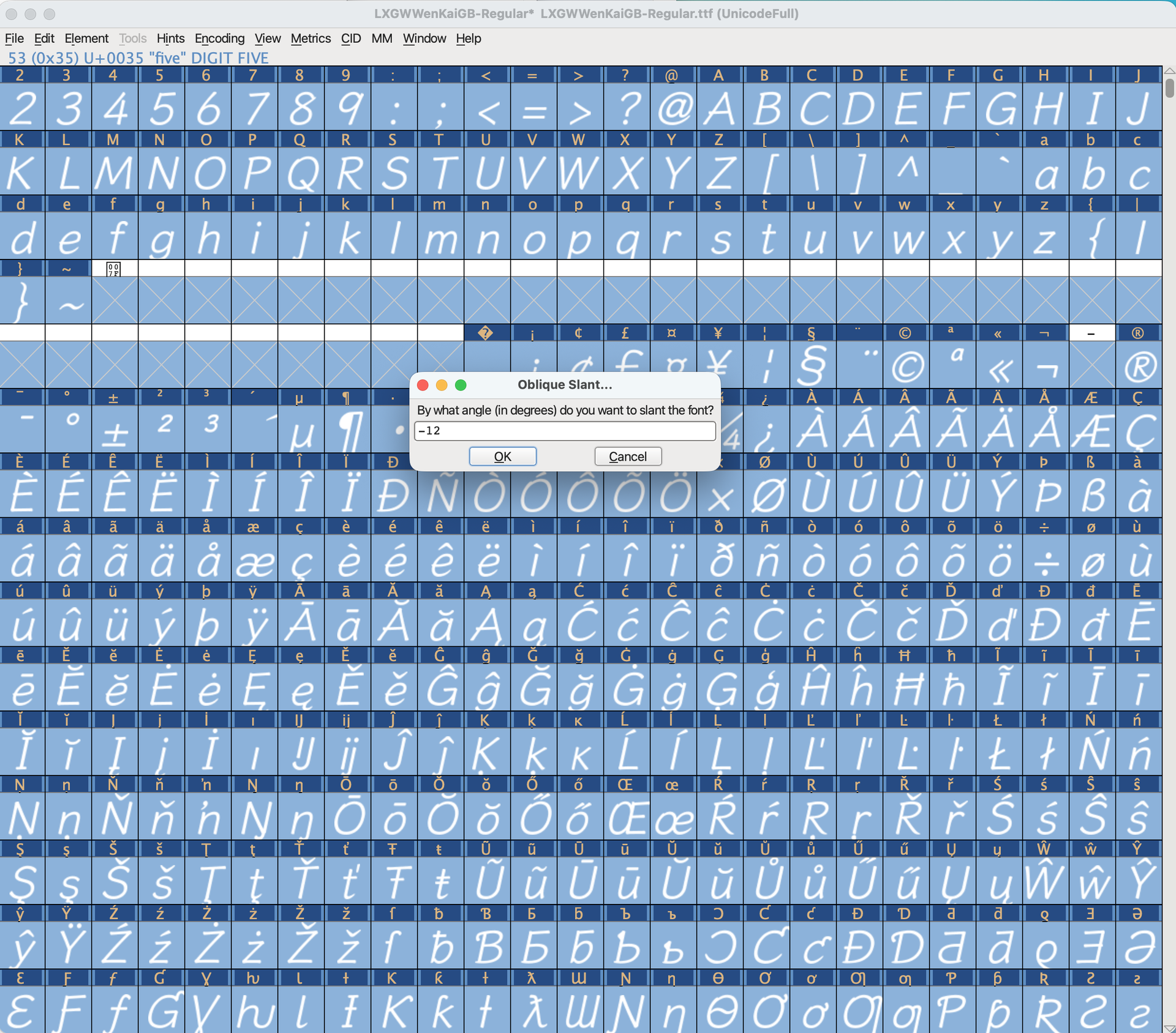 有些编辑器如Typora、Notion默认支持中文斜体,但是NotePlan没有实现中文字体算法倾斜,需要创建专用的斜体字体文件。本文介绍的方法是通过FontForge工具对霞鹜文楷GB字体应用斜体变换,并生成新的字体文件,从而让NotePlan可以直接调用这个字体来显示斜体文本。