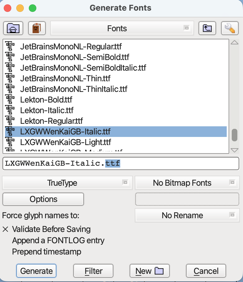 最后一步:通过菜单File → Generate Fonts将字体保存到 /Users/<username>/Library/Fonts/LXGWWenKaiGB-MediumItalic.ttf