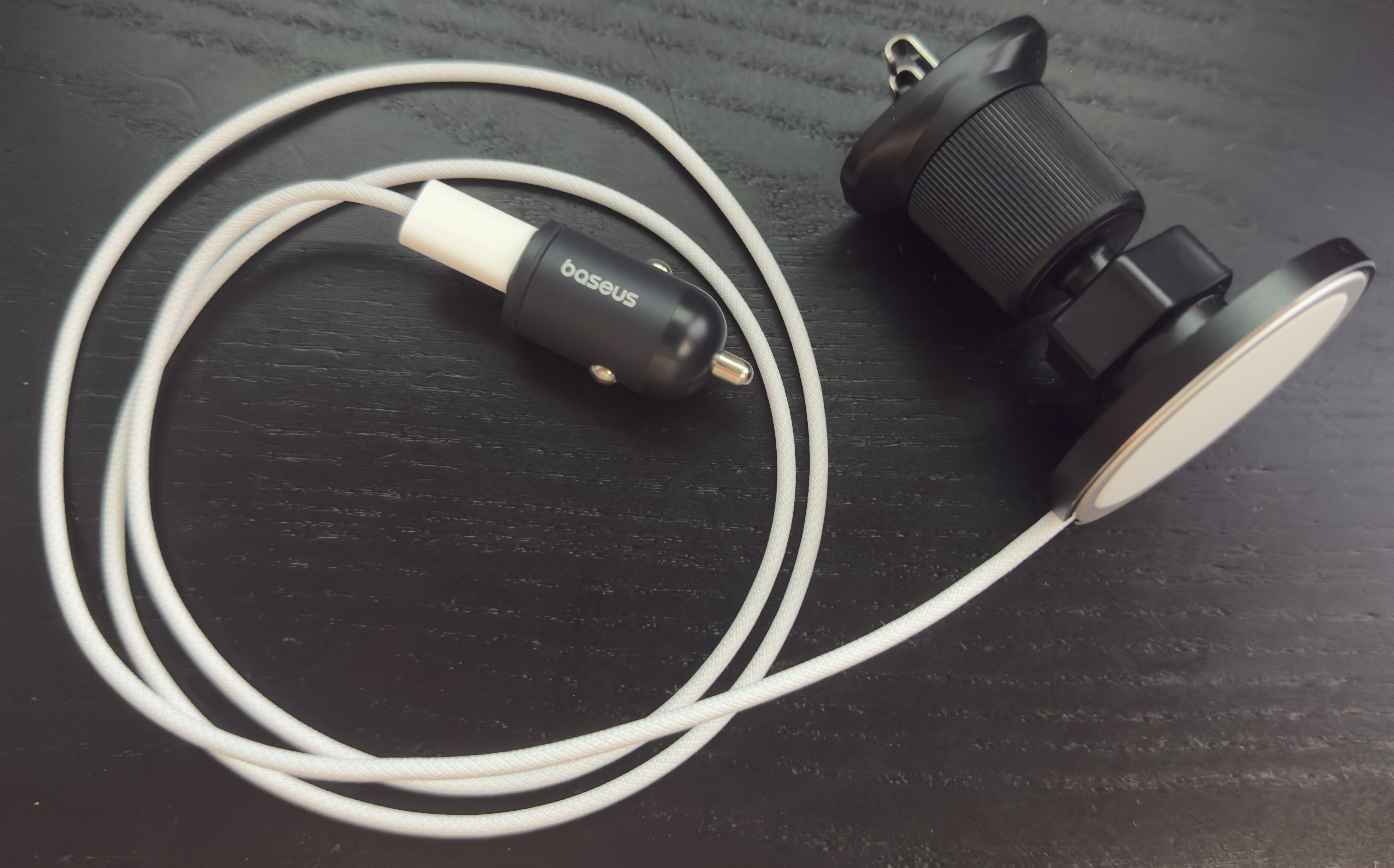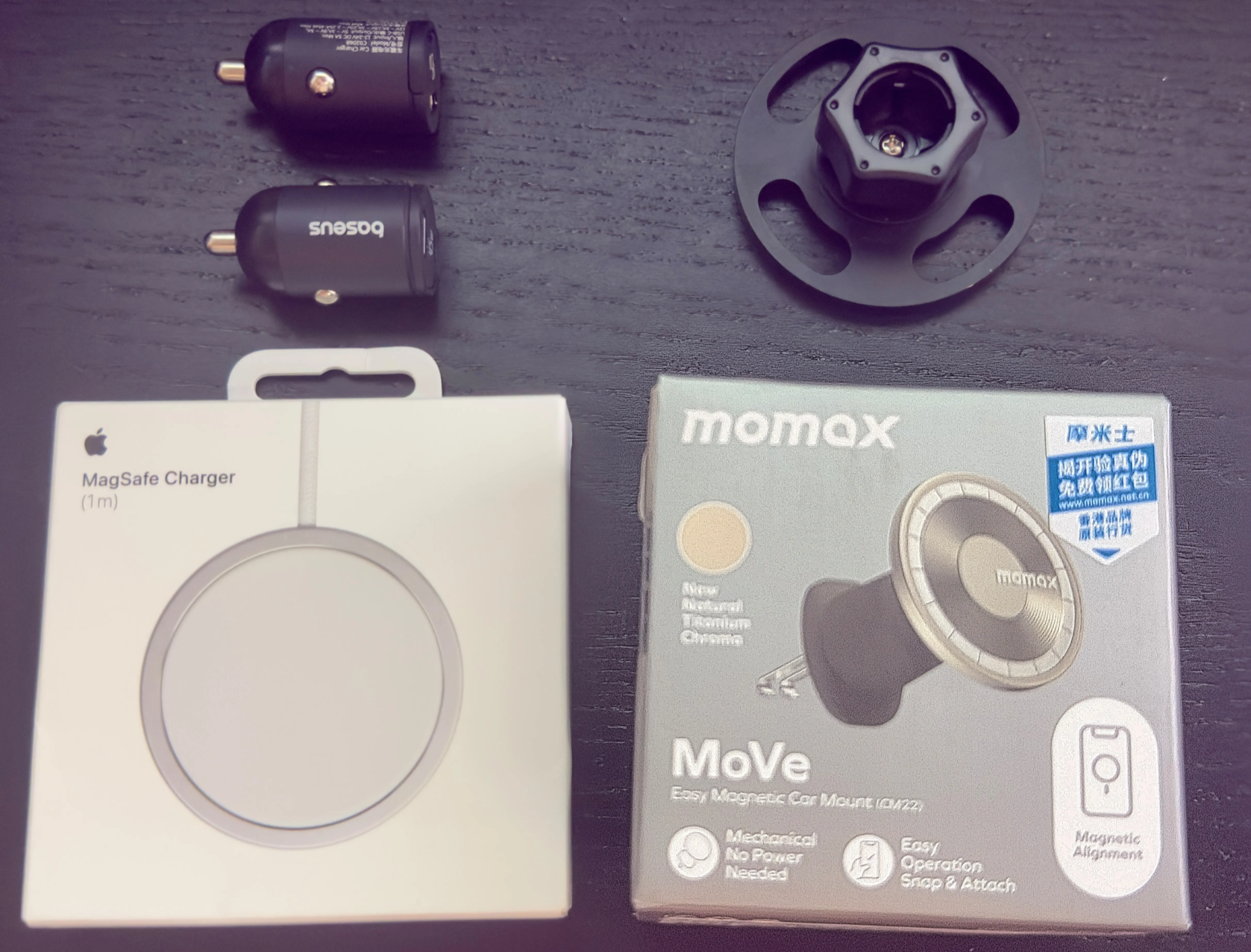 2025年9月更新:推荐Apple 25W MagSafe充电器(最新型号MGD74ZA/A,支持Qi 2.2,充电头网最新拆解)。我搭配了摩米士双钩支架和倍思UFCS 45W迷你车充(支持PD3.0)。