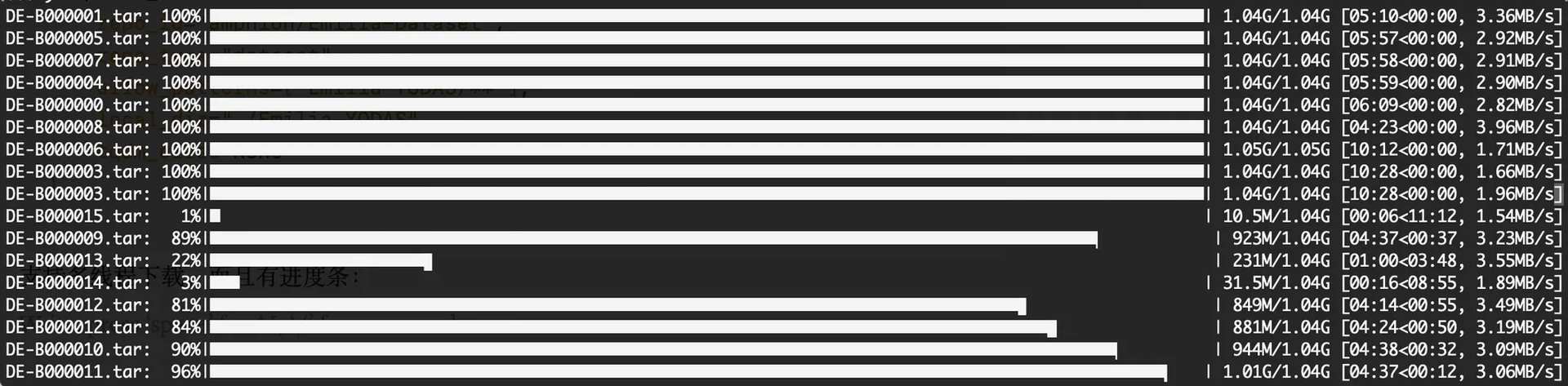 如果中途下载中断了,再次运行会自动跳过已下载的文件,非常方便。这个方法也适用于其他在huggingface上托管的大型数据集,可以根据需要只下载特定的子目录。