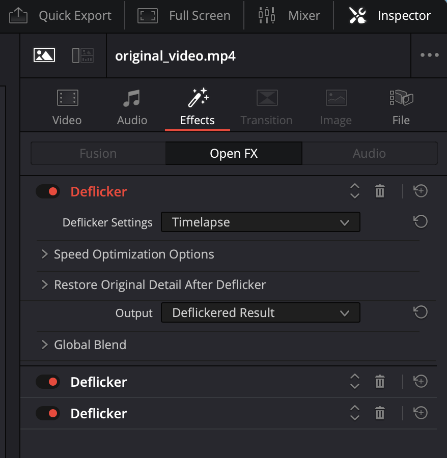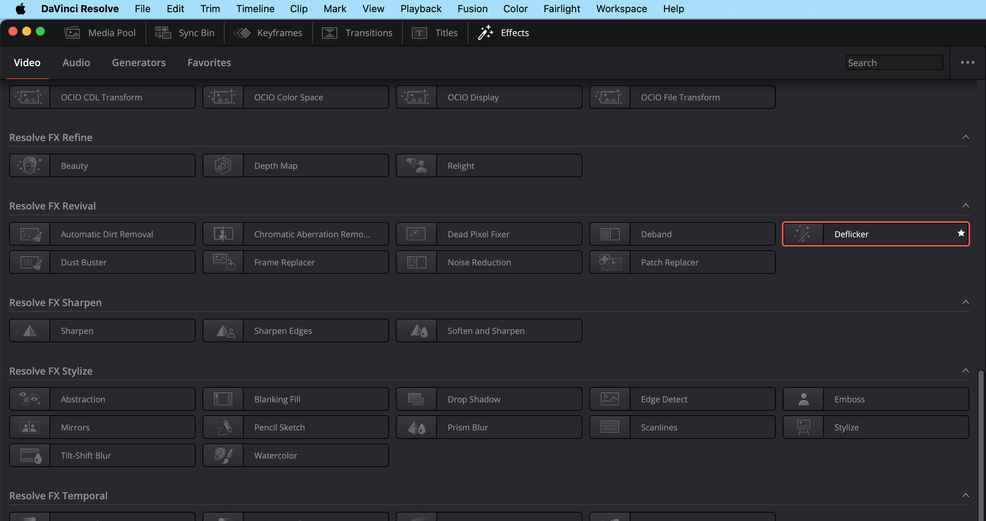 用DaVinci Resolve 20打开这个视频,左上角找到Effects → Video → Resolve FX Revival → Deflicker: