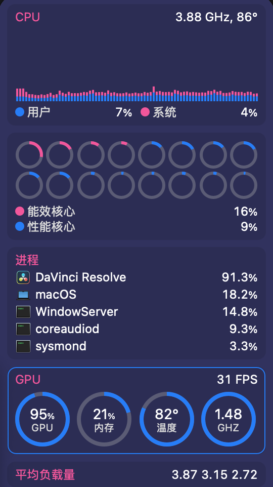 DeVanci Resolve 20在处理视频时,几乎占用了100%的Apple M4 Max GPU: