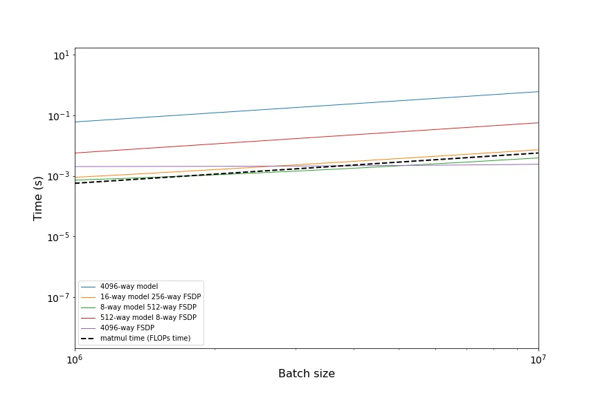 3.94e14 / 8.1e11 = 486,所以规则是B > 486/2 = 243。请注意,这基本上没有变化!T_{\text{math}} = \dfrac{2BDF}{3.94 \times 10^{14}} 和 T_{\text{comms}} = \dfrac{BD + DF + BF}{8.1 \times 10^{11}},所以一个合理的下限是 \max!\big(T_{\text{math}}, T_{\text{comms}}\big),上限是 T_{\text{math}} + T_{\text{comms}}。