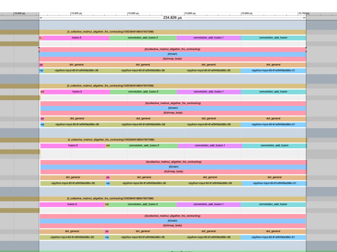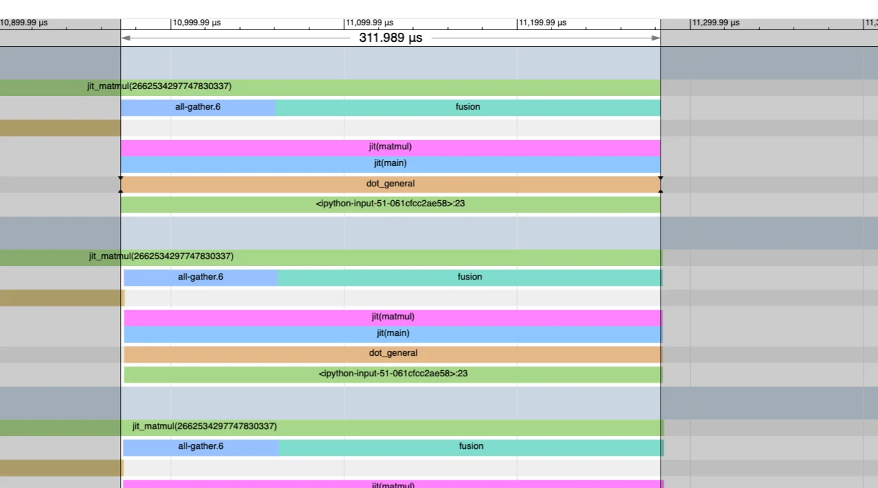 np.testing.assert_array_equal(shmapped_out, expected_out)这相当不错!我们可以对此进行基准测试,发现它也快得多!这里是默认jit矩阵乘法的性能分析,它需要311微秒,开头有一个大的阻塞AllGather:
