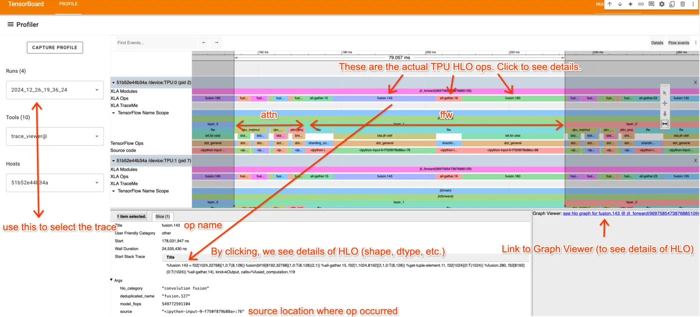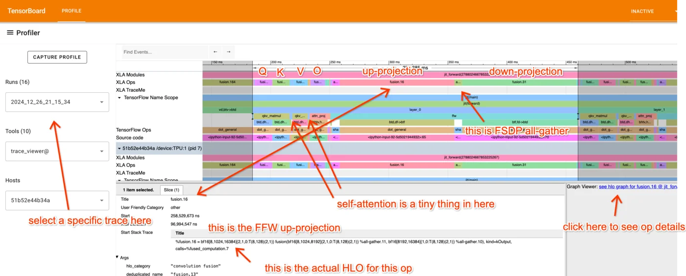 第9章:如何分析TPU代码。实际的LLM从来不像上面的理论那么简单。这里我们解释JAX + XLA堆栈,以及如何使用JAX/TensorBoard分析器来调试和修复实际问题。