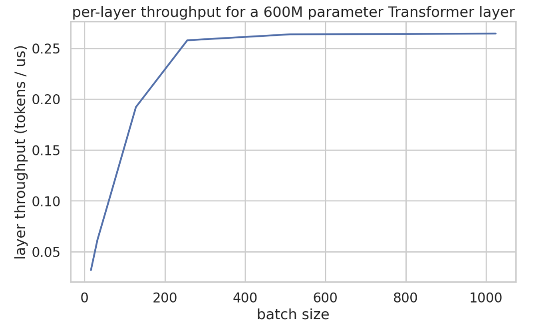 💡 要点:对于大多数TPU上的bfloat16矩阵乘法,要使其受计算限制,我们需要使我们的本地批量大小(以token为单位)大于240。