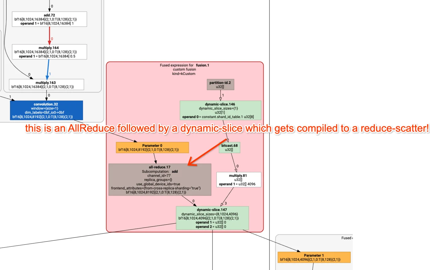 jax.jit,会发生一些事情。分析一下它决定进行什么通信。这需要多长时间?你会注意到上述方法的一个问题是,它可能会在本地收集完整的激活集A,即AllGather_X([S_X, D_Y])。这不仅在通信方面代价高昂,如果我们无法在本地适配完整的激活集,在内存方面也极其昂贵。使用
