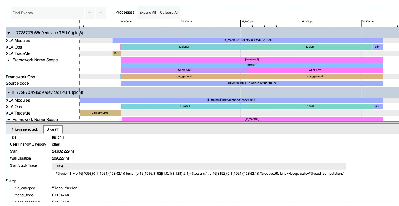 值得注意的是,在收缩维度上没有分片的矩阵乘法时间是224微秒,所以我们非常接近未分片的基准。这是一个很好的例子,说明了你可能会进行何种性能工程来提高TPU利用率。有关shard_map的更多示例,这篇笔记很棒。