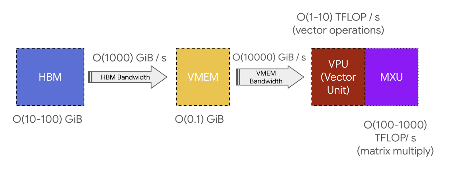 芯片内部通信:在加速器内部,张量需要在片上内存(HBM)和计算核心之间传输。这种链接的带宽被称为"HBM带宽"。在H100上,这约为3.35TB/秒,在TPU v6e上约为1.6TB/秒。