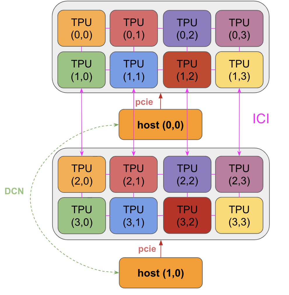 芯片间通信:当我们跨多个加速器分布模型时,张量经常需要在它们之间传输。在我们的硬件上通常有几个选项(ICI、DCN和PCIe),每个选项都有不同的带宽。