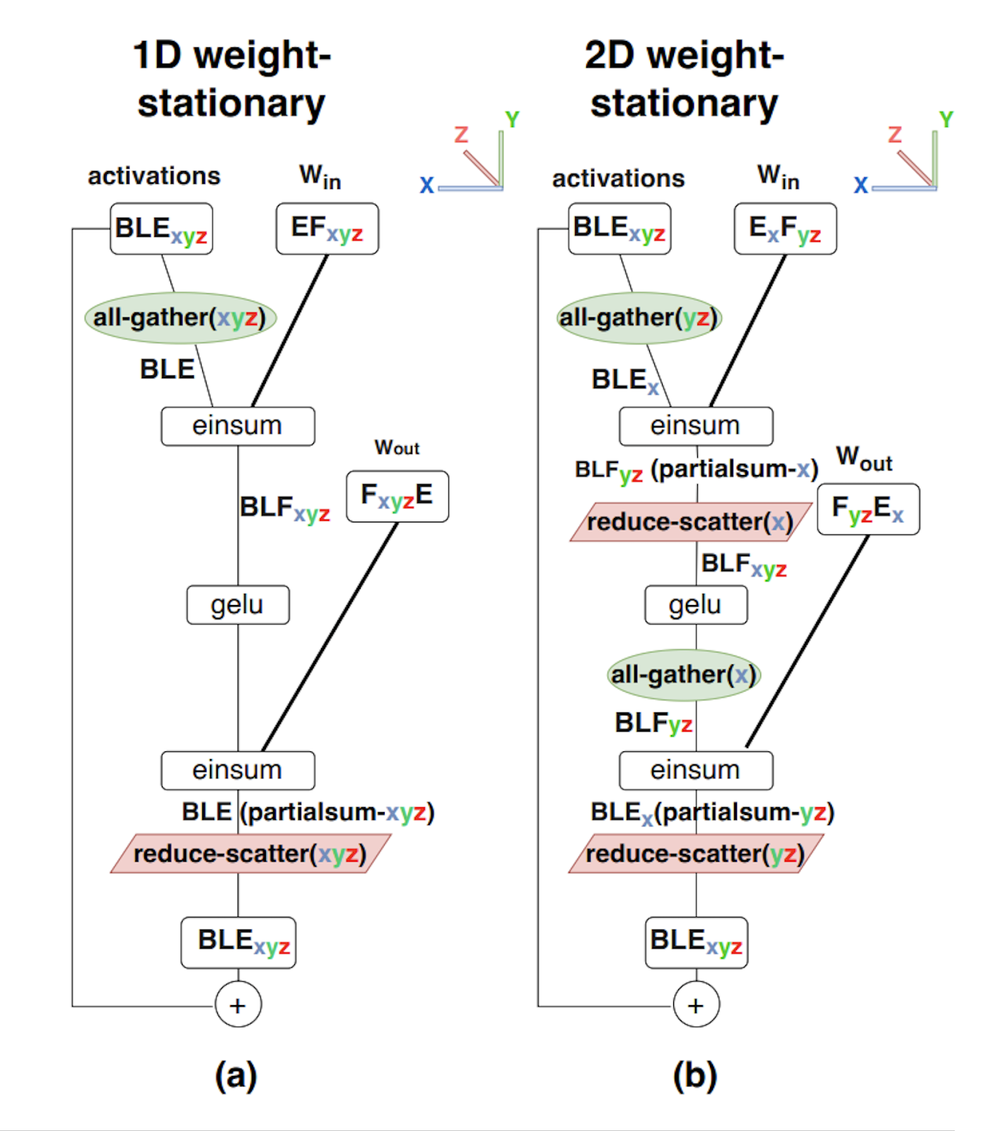 将这两者结合到一个端到端的Transformer块中,该块执行In[B_X, D_Y] *D W{in}[D, F_Y] *F W{out}[F_Y, D] \to Out[B_X, D_Y],并具有重叠通信。这比