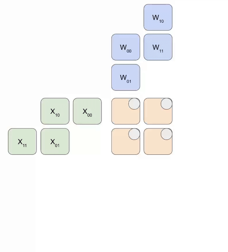 作为练习,让我们先实现一个AllReduce集体矩阵乘法,即A[B_X, D_Y] *_D W[D_Y, F] \to Out[B_X, F]。注意输出不是复制的。上面讨论了朴素算法,基本上就是本地矩阵乘法后跟一个AllReduce。尝试制作一个通信重叠的"集体"版本的这个操作。提示:在输出维度上进行分块,随意使用