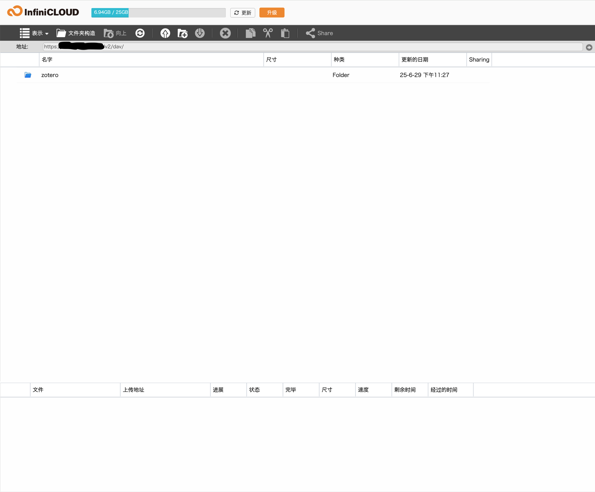 测试多个WebDAV服务后,最后选择了InfiniCLOUD,它提供了25GB免费存储空间,对Zotero的支持好,同步速度很快。