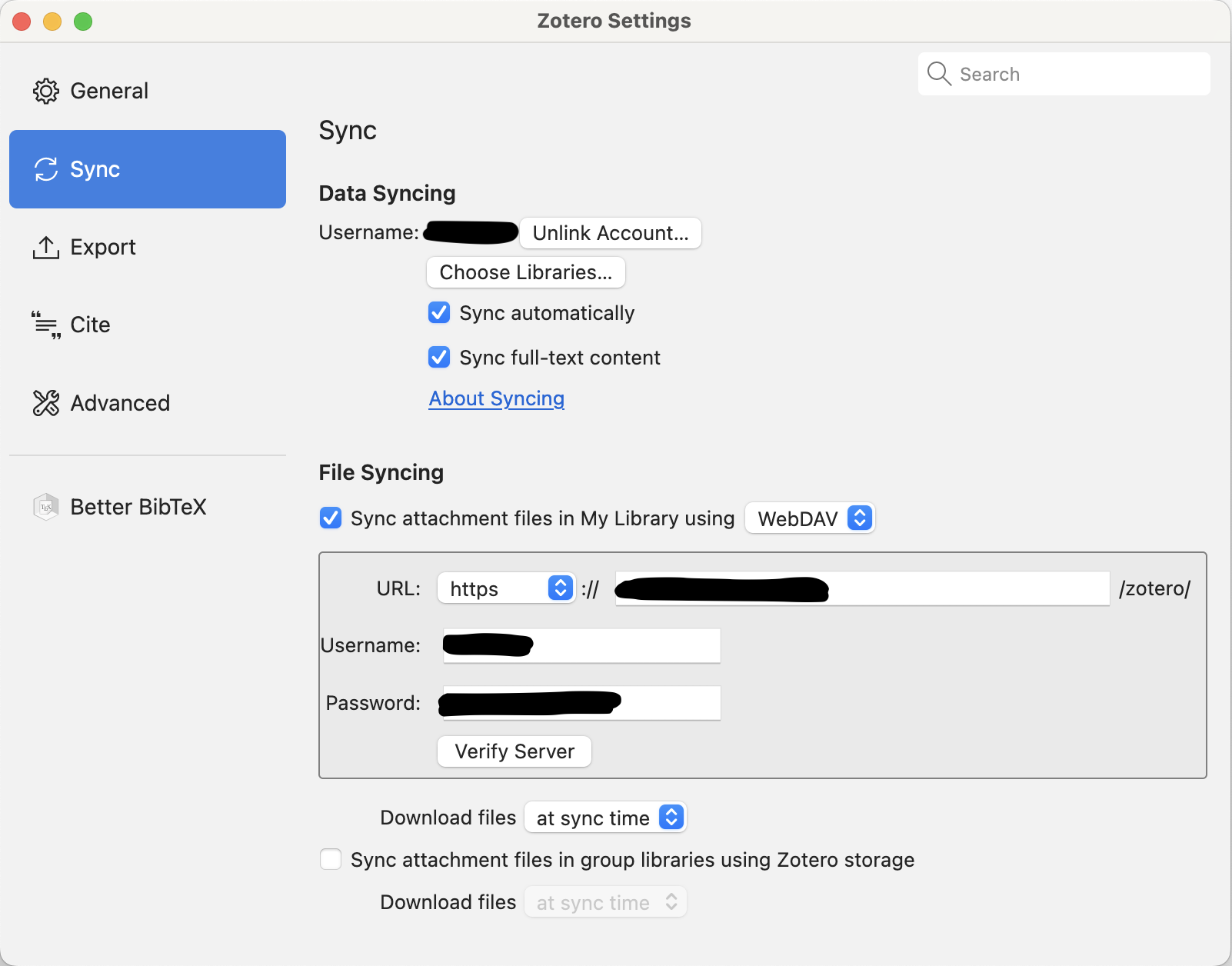 注册好WebDAV空间之后,打开Zotero 7设置,在"File Syncing"中选择"Sync attachment files in My Library using WebDAV",输入WebDAV信息并Verify Server即可。
