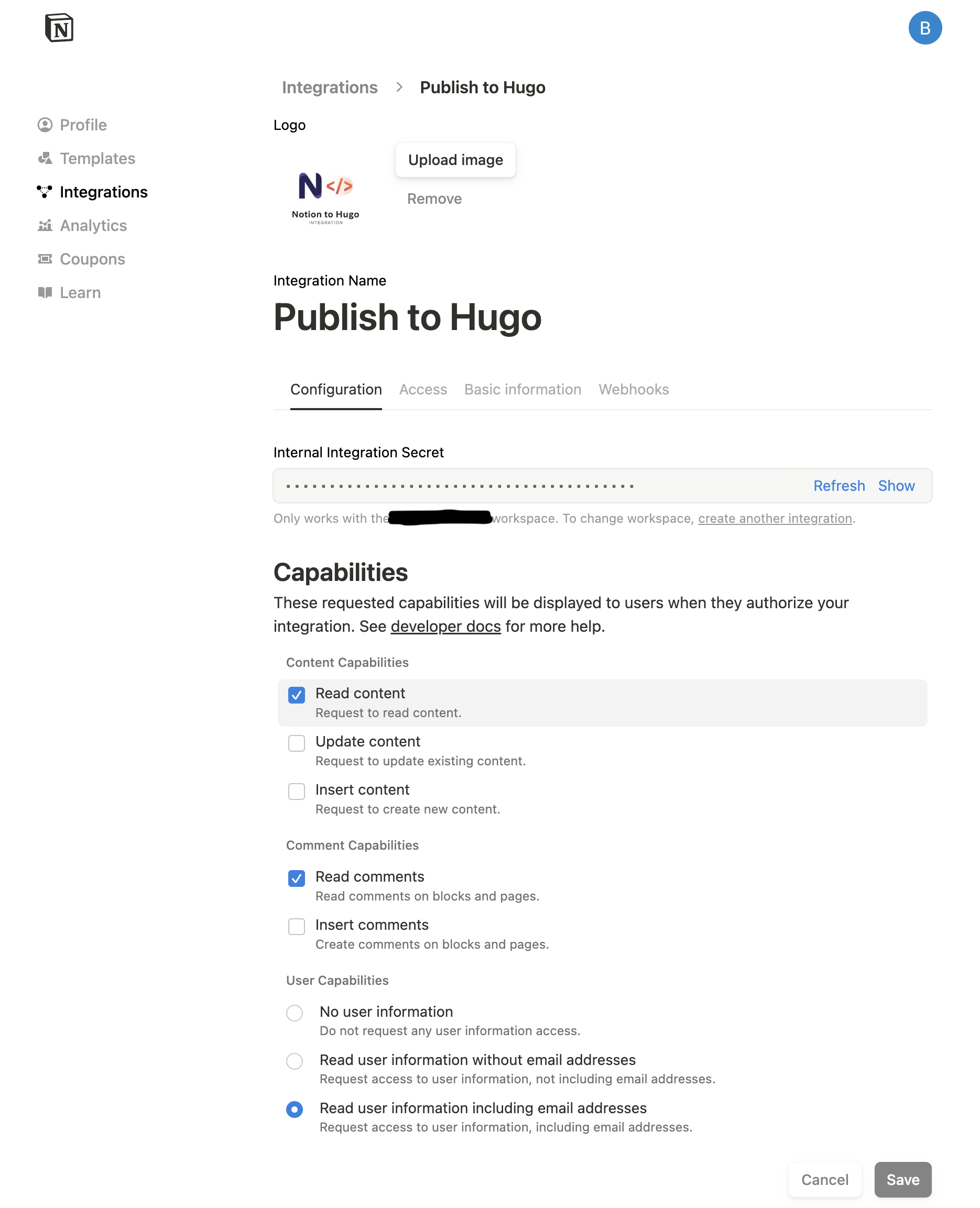 在 Notion 中创建 Integration 并获取 Token。
