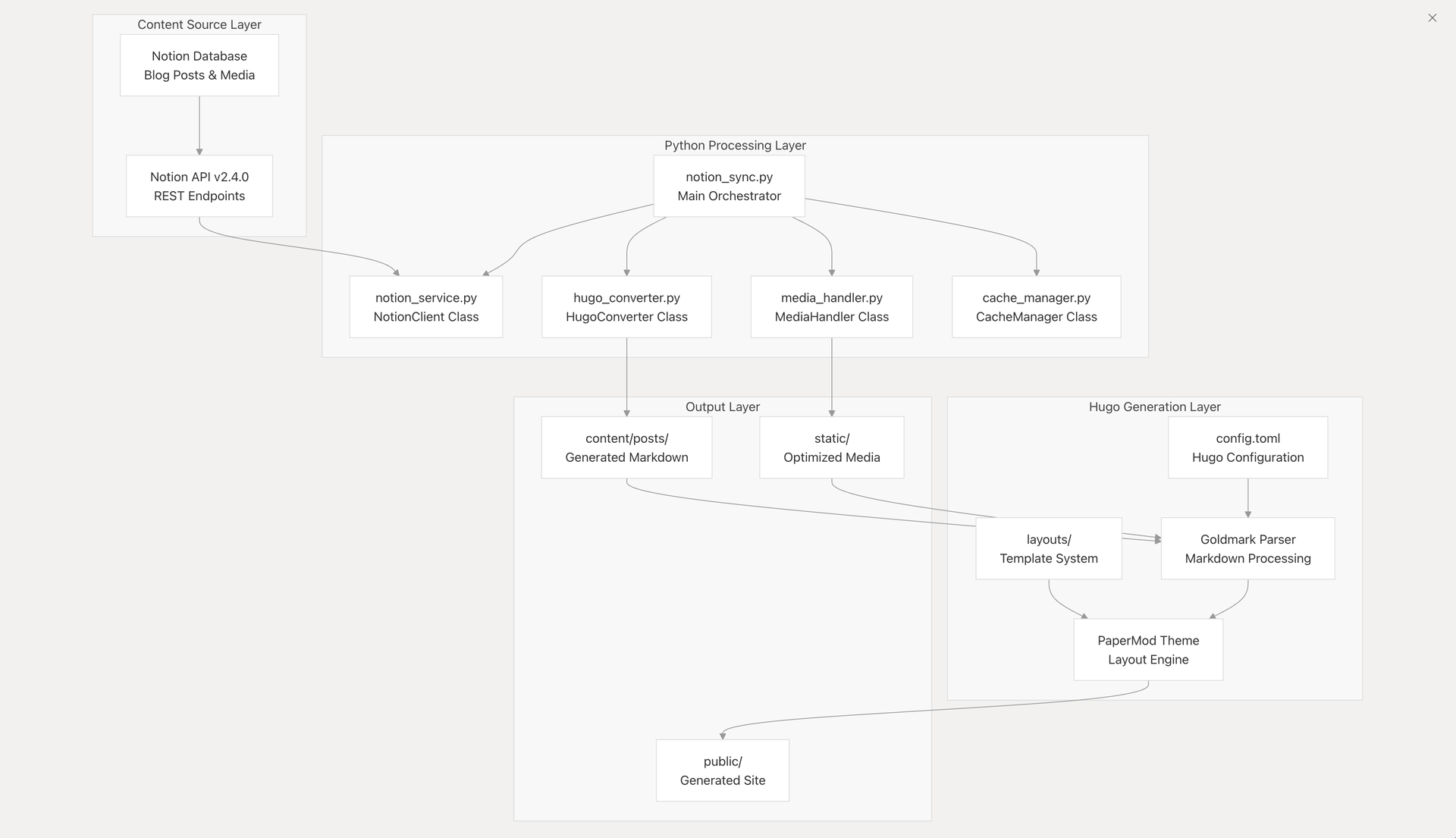 这个项目的核心逻辑很直接:从 Notion 数据库读取文章,将其转换为 Hugo 所需的 Markdown 格式,最后自动构建并部署到 Cloudflare Pages。